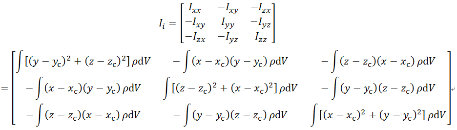 为了求出惯性矩,先看单个刚体的转动惯量或惯性积。假定一刚体绕通过其质心的任意方向的轴线旋转,则在固定坐标系内刚体的转动惯量可用一个3×3的对称阵表示,称为惯性矩阵: