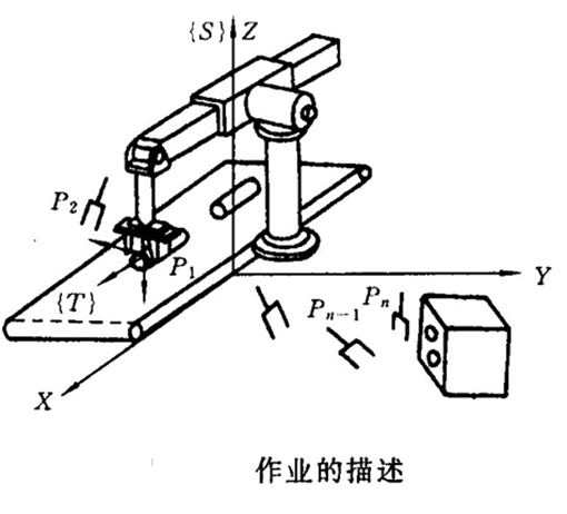 工具坐标系相对于工作坐标系的运动来描述作业路径。它把作业路径的描述与具体的机器人、手爪或工具分离开来,形成了模型化的作业描述方法。从而使这种描述既适用于不同的机器人,也适用于同一机器人上装夹不同规格的工具。有了这种描述方法,就可以把图5.4所示的机器人从初始状态运动到终止状态的作业看作是工具坐标系从初始位置到终止位置的坐标变换。
