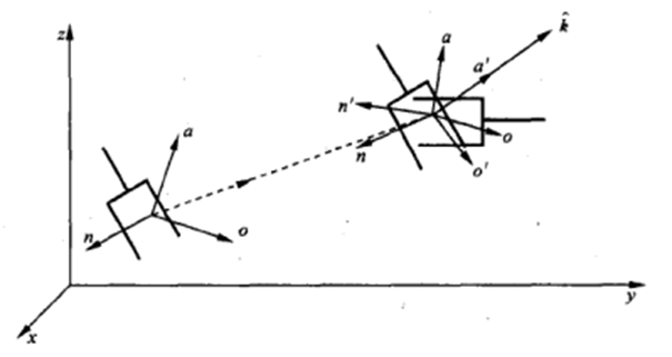 (2)将起始点和终止点之间的变换R分解为一个平移运动和一个绕点轴的旋转运动。平移仍是将坐标原点从起始点移动到终止点,而旋转是将手臂坐标系与最终的期望姿态对准,两个变换也是同时进行的,如图5.12所示。