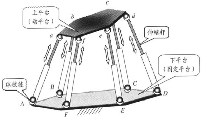 在1965年,Stewart提出—种新型的、6 自由度的空间并联机构,它由上下两个平台和6个并联的、可独立自由伸缩的杆件组成ꎬ 伸缩杆和平台之间通过两个球铰链A、B、C、D、E、F 和a、b、c、d、e、f 连接,称为Stewart平台,如下图所示。从图中可见,如果将下平台作为定平台,以伸缩杆的位移作为输入变量,则可以控制上平台(动平台) 的空间位移和姿态。这种新型的、6 自由度的空间并联机构引起众多研究者的兴趣,经过30 多年的不断改进和发展,演变出不同运动学原理和结构的空间并联机构,并在许多科学研究和工业领域获得了广泛应用。