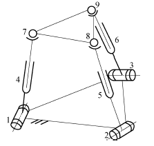 由图可知,该机构的总的构件数M=8。运动副数=9,其中运动副1~3为转动副,其自由度皆为1,运动副4~6为移动副,它们的自由度也为1,运动副7~9是球面副,每个球面副的自由度为3,所以,则有: