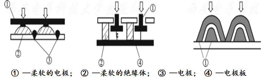 触觉传感器开关是用于检测物体是否存在的一种最简单的触觉制动器件。当一个电极上承受大于阈值的力时,该电极与另一个电极接触,这样可以用一个电回路来检测该开关接触与否,如图9.26所示。