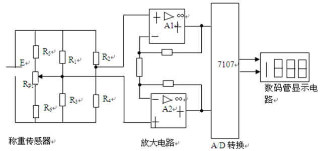 根据制作要求,这里称重传感器采用电阻应变式传感器,即: 当物体放在秤盘上时,压力施给传感器,该传感器发生形变,从而使阻抗发生变化,同时使用激励电压发生变化,输出一个变化的模拟信号。该信号经放大电路放大输出到模数转换器,转换成便于处理的数字信号,输出到数码管显示。故该电子秤的电路原理图如9.28所示。