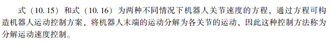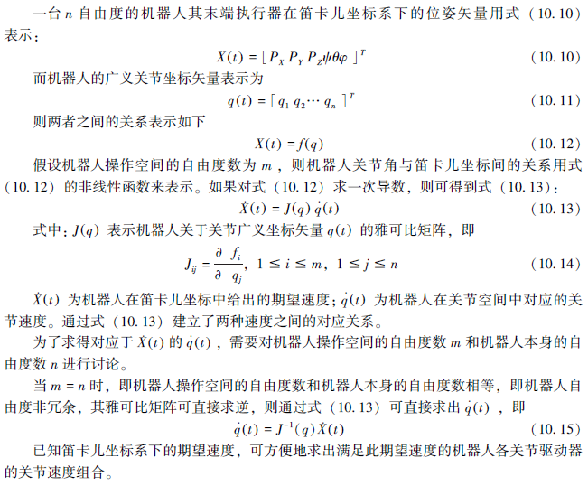 分解运动的速度控制要求各伺服系统的驱动器以不同的分速度同时联合运行,能保证机器人的末端执行器沿着笛卡儿坐标轴稳定地运行。控制时先把末端执行器期望的笛卡儿位姿分解为各关节的期望速度,然后再对各关节进行伺服控制。