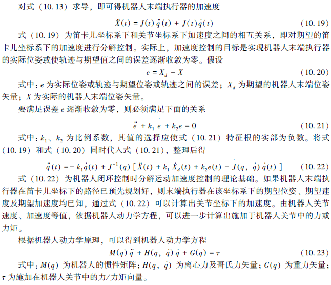 机器人分解运动的加速度控制是分解运动速度控制概念的扩展,其方法是把机器人末端执行器在笛卡儿坐标系下的加速度值分解为关节坐标系下相应各关节的加速度,这样根据相应的系统动力学模型就可以计算出所需施加到各关节电动机上的控制力矩。