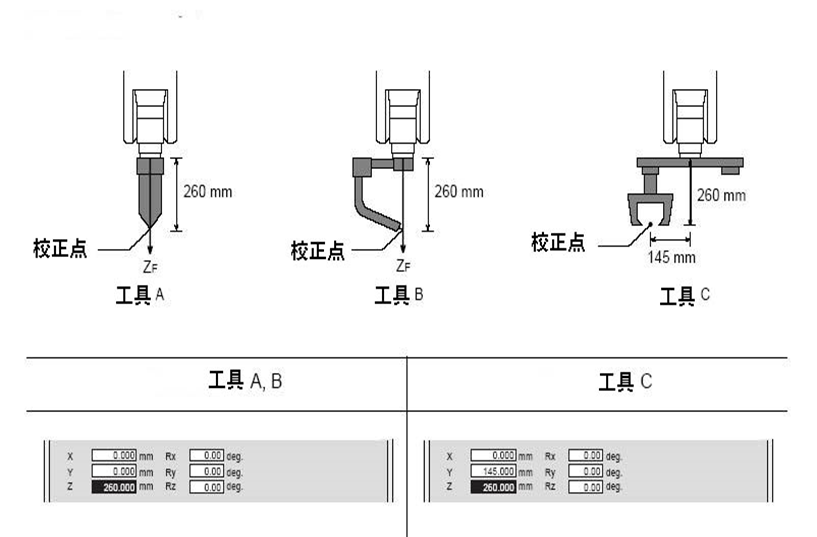 要保证机器人能够按照一定的精度完成任务,在将工具安装到机器人上后,需要对工具进行设定,即: 保证工具的中心点与校正点重合,如图11.46所示。由于机器人的末端执行器(工具)的形式多种多样,所以校正方法也不尽相同。但末端执行器(工具)大致可分为三类,校正时可按如图11.47所示进行。