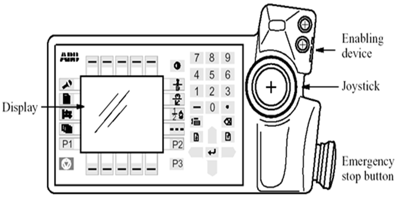 示教器由Emergency stop button(E-Stop)(急停开关)、Enabling device(使能器)、Joystick(操纵杆)、Display(显示屏)组成,如图12.7所示。
