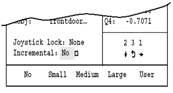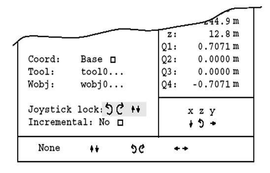 进入操纵窗口后,使用光标移动键将光标移至选项Joystick lock,此时显示器下端功能键上将显示None与三种箭头共四种选项,如图12.13所示,按相应功能键选择锁定机器人操纵杆前后、左右与旋转。