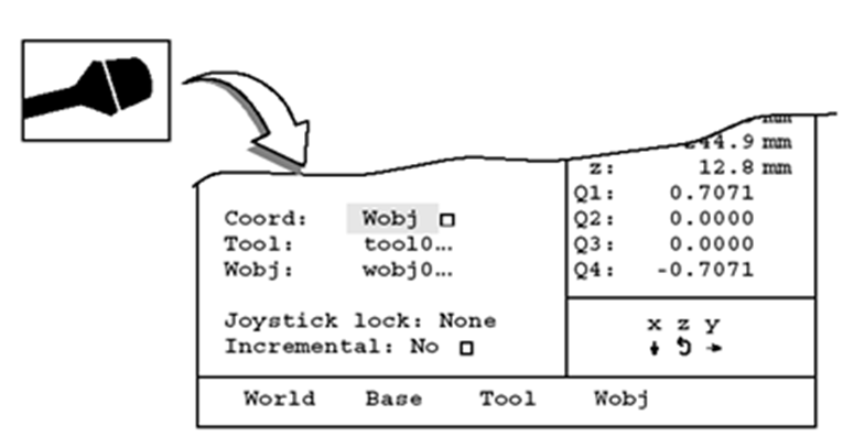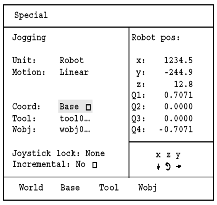 进入操纵窗口后,使用光标移动键将光标移至选项Coord,此时显示器下端功能键上将显示World、Base、Tool、Wobj四种选项,按相应功能键选择坐标系,如图12.10所示。