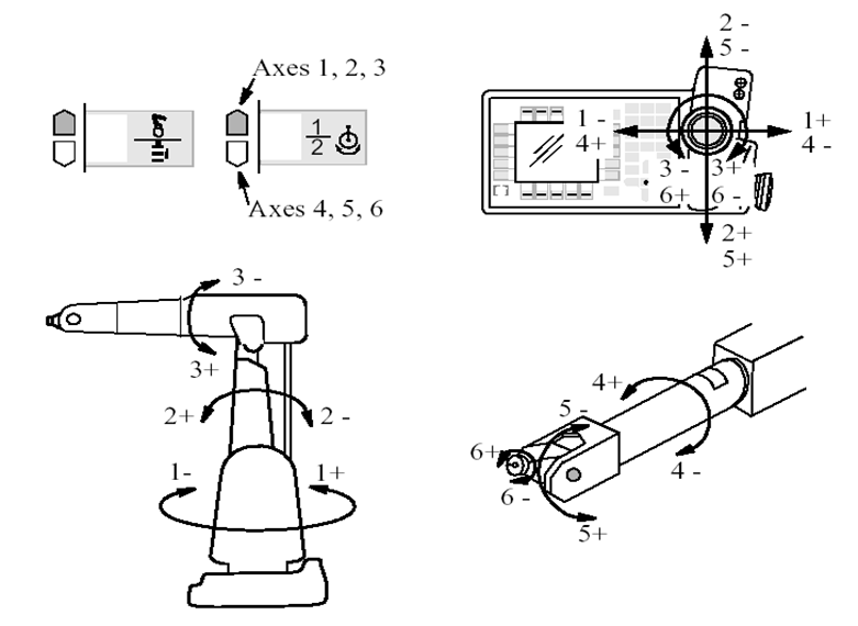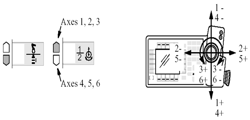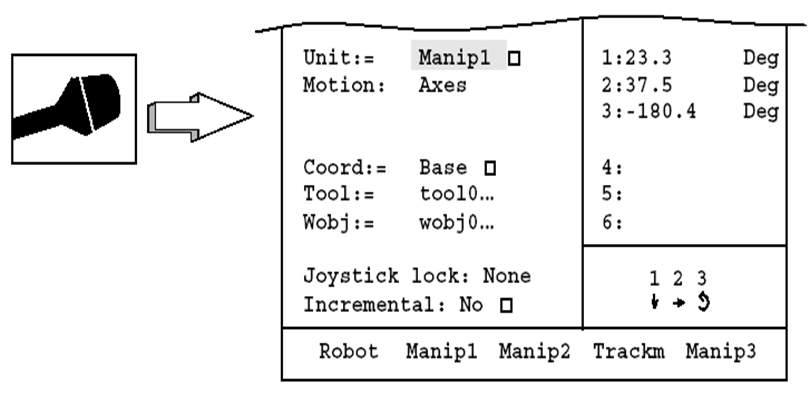 若让机器人改变运动姿态,首先在示教器上找到Motion keys(运动控制键),将Motion Unit(运动单元切换键)切换到Robot(机器人),即:光标指向机器人。然后,选择Motion Type 2(运动模式切换键2)。此时机器人以如图12.26所示的方式单轴运动。