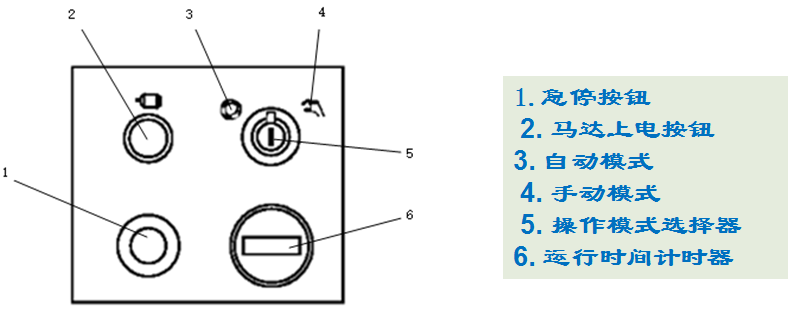 机器人操作面板上有多个功能按钮,如图12.6所示。这些按钮包括:马达上电按钮、机器人急停按钮、操作模式选择器和运行时间计时器。
