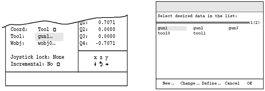 进入操纵窗口后,使用光标移动键将光标移至选项Tool,如图12.11(a)所示。按回车键,此时显示器显示机器人系统内部工具清单,如图12.11(b)所示。使用光标移动键将光标移至相应的工具,通过功能键OK选择。