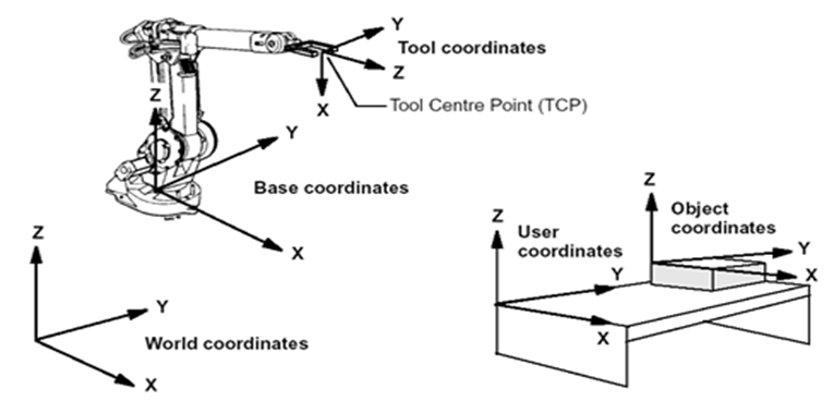 如图12.9所示,机器人的坐标系包括:World coordinates(大地坐标系)、Base coordinates(基础坐标系)、Tool coordinates(工具坐标系)、Work object coordinates(工件坐标系)。