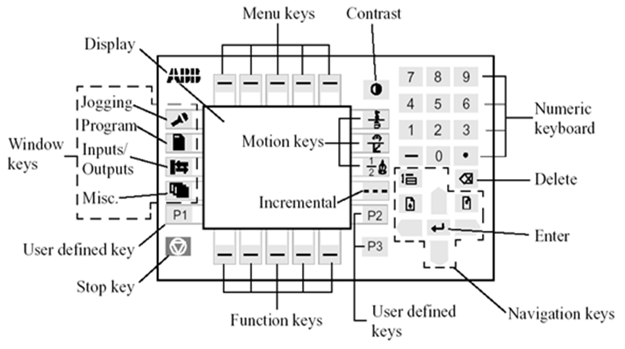 示教器面板各键的功能如图12.8所示。其中窗口键(window Keys)包括Jogging(操纵窗口)、program(编程窗口)、Input/Outputs(输入/输出窗口)、Misc.(其他窗口)四个键。Jogging(操纵窗口)用于手动状态下,操纵机器人,此时显示屏上显示机器人相对位置及当前坐标系。Program(编程窗口) 用于手动状态下编程与测试。Input/Outputs(输入/输出窗口),用来显示输入输出信号表与其数值。可手动给输出信号赋值。Misc.(其他窗口):包括系统参数、服务、生产以及文件管理窗口。