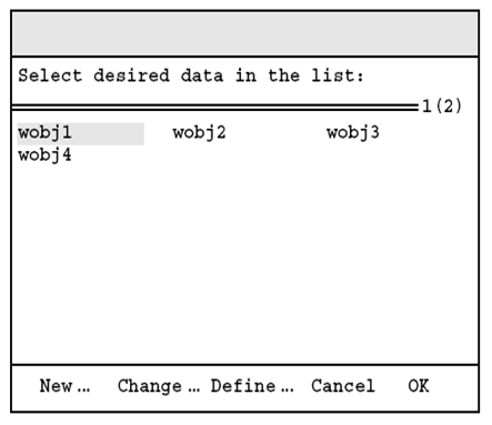 使用光标移动键将光标移至选项Wobj,按回车键,显示器显示工件坐标系清单,如图12.12所示,将光标移至相应的工件坐标系,通过功能键OK选择。注意:只有机器人坐标系Coord选择Wobj时,此项选择才起作用。