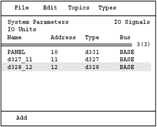 进入系统参数窗口的其他窗口选择System Parameters点击回车,进入I/O单元窗口,如图12.46所示。点击菜单键Topics选择IO Signals下的菜单键Types,选择1 Units。用功能键Add增加新I/O板. 用删除键可删除光标所指向的I/O板。