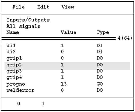 输入输出窗口如图12.45所示,在输入输出窗口或编程窗口不能更改或定义输入输出信号,所有操作只能在系统参数中进行。窗口显示所有用户信号,对D0信号可以手动用功能键赋值1或0。当手动对机器人输出信号赋值时,与机器人配合的外围设备可能会运动,注意安全!