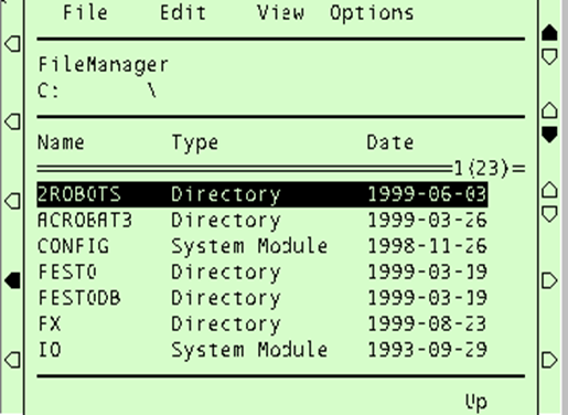其他窗口→FileManager→回车,进入文件管理窗口,如图12.48所示。文件管理窗口有以下几个选项: Directory(子目录),Program(程序),Program Module(程序模块),System Module(系统模块),功能键Up (使屏幕回到上一层子目录)。