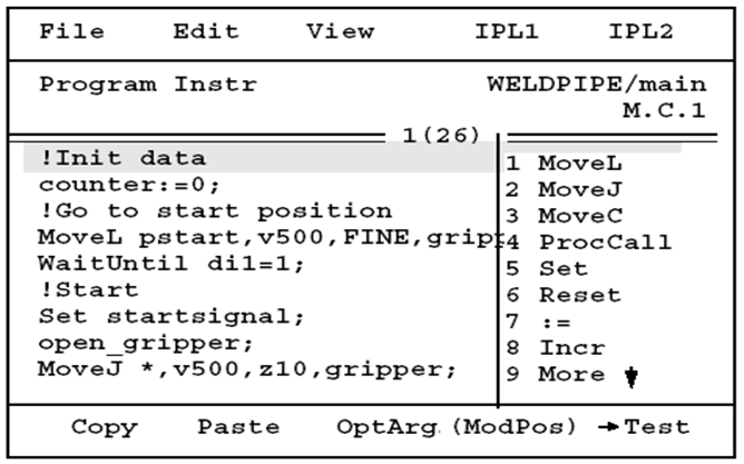 机器人的编程界面如图12.36所示。由菜单键File、Edit、View、IPL1与IPL2组成。菜单键File包括:Open用来打开一个现有文件,文件类型为:程序.prg或模块.mod。 New用来新建一个程序,Save program用来存储更改后的现有程序,Save program as用来存储一个新程序,Print用来打印程序,现已经不使用。Preferences用来定义用户化指令集,Check program用来检验程序,光标会提示错误。Close用于在程序储存器中关闭程序。Save module用来存储更改后的现有模块,此选项只在Module窗口中存在。Save module as用于存储一个新模块,此选项只在Module窗口中存在。