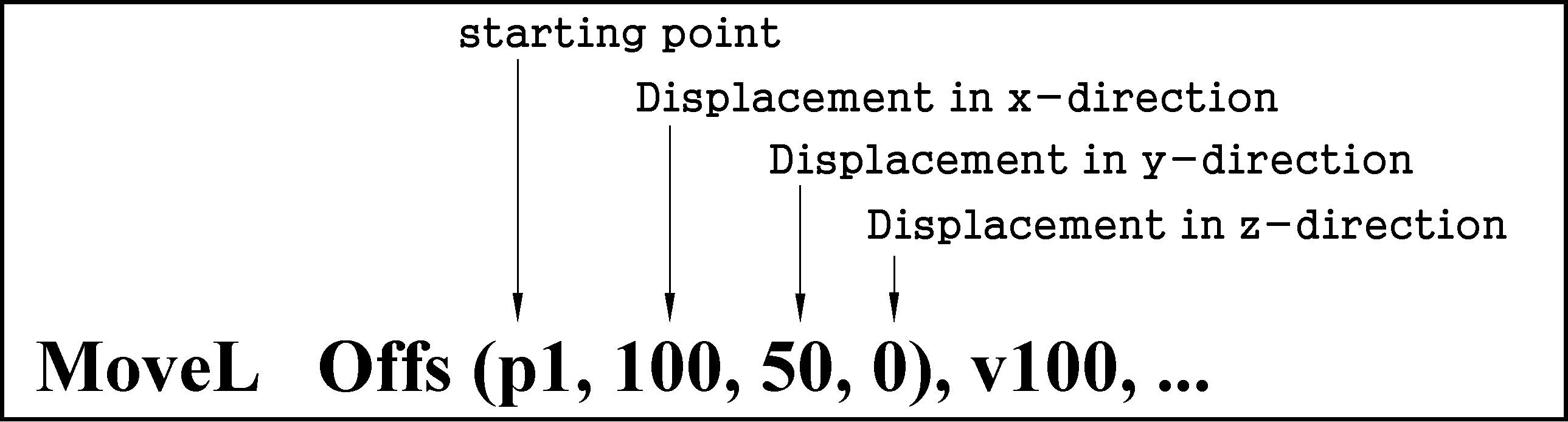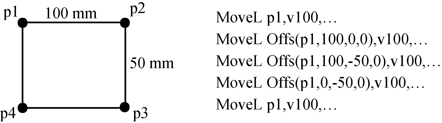 如图12.38所示,要达到p1、p2、p3、p4点,可以用图右侧的语句来实现。但为了精确确定p1、p2、p3、p4点,也可以使用函数Offs()。函数Offs中各参量的含义如图12.39所示。Offs(p1,x,y,z) 代表一个离p1点X 轴偏差量为x,Y 轴偏差量为y,Z轴偏差量为z的点。将光标移至目标点,按回车键,进入目标点选择窗口,在功能键上选择Func,采用切换键选择所用函数Offs()。如图12.40所示,要达到p1、p2、p3、p4点,可以用图右侧的语句来实现。