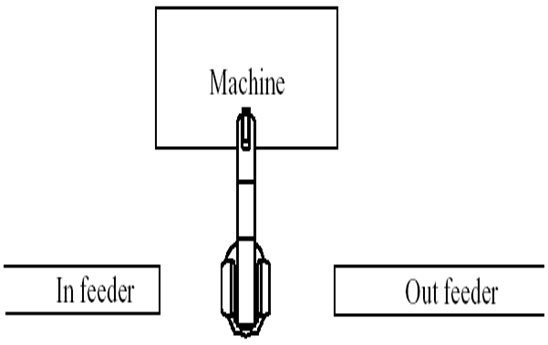 机器人位置布局如图12.41所示,首先,机器人从进料运输带(In feeder) 抓取工件,放至机器(Machine) 中加工,加工完成后,机器人再从机器中将工件取出,放至出料运输带上,完成一个循环。