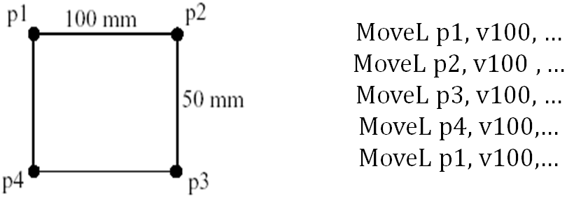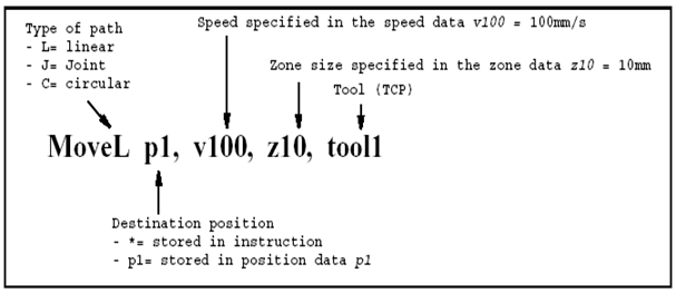 基本运动指令包括:MoveL(线性运动)、MoveJ(关节轴运动)、MoveC(圆周运动)、p1(目标位置)、 v100=1(运行速度mm/s)、z10(转弯区尺寸mm)、tool1(工具中心点TCP)。各指令中的大写字母代表的含义如图12.37所示。