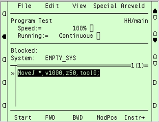 在测试窗口按切换键,并且将光标移至运动速率选择(Speed),此时,功能键显示-%、+%、25%与100%选项,使用功能键确定运行速率。机器人实际运行速度为程序运动指令定义速度乘以相应百分比,最大不超过250mm/s。-%与+%在1%至5%之间将以1%递增或递减,-%与+%在5%至100%之间将以5%递增或递减。25%与100%是将机器人运行速率快捷的切换至25%与100%。运行速度调整可在程序运行时同步进行。在焊接程序中,运行速度选择只改变空行程速度,焊接速度不变。