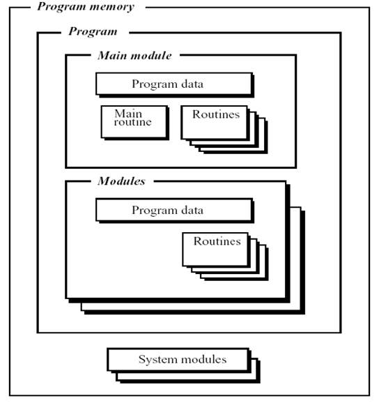 程序储存器(Program memory)由应用程序(Program)和系统模块(System modules) 组成,如图12.35所示。其中,应用程序( Program )包括:主模块(Main module)、主程序(Main routine)、程序数据(Program data)、例行程序(Routines)、程序模块(Program modules)、程序数据(Program data)、例行程序(Routines)。系统模块(System modules)包括:系统数据(System data)和例行程序(Routines)。
