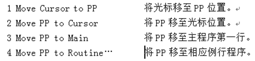 菜单键Edit包括:Cut用于剪切指令或数据,用Cut可能会丢失指令或数据。Copy用于复制数据或指令。Paste用于将剪切或复制的指令或数粘贴到相应位置。Go to Top,将光标移至顶端。Go to Bottom,将光标移至底端。Mark,定义一块,涂黑部分。Change Selected,修改指令中数据,可直接将光标,移至相应位置按回车键。Show value,输入数据,可直接将光标移至相应数据按回车键。Modpos,修改机器人位置,功能键上有。Search,寻找指令,程序复杂时很有用。