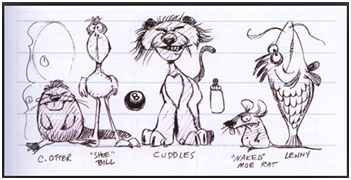 在设计多个角色时,要普遍使用对比的外形轮廓,比如高和矮,胖和瘦。可当故事要求所有角色都有相同的大小和外形时,他们的动作和轮廓可能是一样的,颜色、道具、服装和不同的身体语言可以区分同一形象的不同角色。(图示:三只小猪)