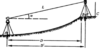 2.光电测距仪测设 安置光电测距仪于测点,瞄准已知方向。沿此方向移动棱镜位置,使仪器显示值略大于测设距离D,定出一点。在这一点安置棱镜,直接测定水平距离D′或测出棱镜的竖直角α及斜距L计算水平距离: