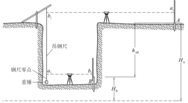 沿在±0标高桩上下移动水准尺,使读数为1.116m,在尺底标定标高线。 2.高程传递(向较深的基坑或较高的建筑物上测设高程) ①悬吊零点向下检定钢尺,尺下端挂与检定拉力同重铅锤,放于油桶内阻尼晃动。 ②在水准点与钢尺之间安置水准仪,读取前后视读数。 ③在待测设处安置水准仪,读取钢尺上读数,按照高差概念计算待测设水准点应读数,标定。
