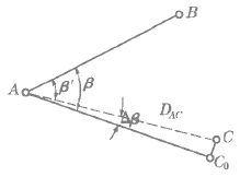 自点沿的垂直方向量出距离,定出点,则就是要测设的角度。 举例:必须用精密方法测设的已知水平角,在点用经纬仪正镜位置测设后,用多测回实测得其角值实为,丈量长为48.20米,问在点沿垂线向何方修正多少长度得点、使为所要测设的值。 解: