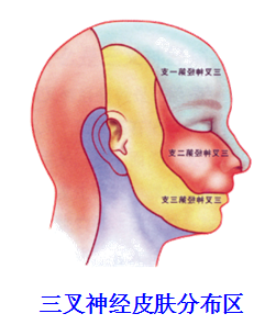 面部的感觉神经为三叉神经的分支,眶上神经是三叉神经第一支眼神经的分支,眶下神经是第二支上颌神经的分支和颏神经为第三支下颌神经的分支等。这三条神经进入面部的孔(眶上切迹或孔,眶下孔和颏孔)是在一条垂直线上,这条垂直线在活体上是相当子两眼平视时,瞳孔的垂线。三叉神经三个支的分布范围,可以眼裂和口裂为界,即第一支,眼神经分布于眼裂以上的额部皮肤,相当于胚胎发育的额鼻突。第二支,上颌神经分布眼裂与口裂之间的皮肤,相当于胚胎时的上颌突。第三支下颌神经,分布于口裂以下和外耳以前的大部分皮肤,相当于胚胎时的下颌突。耳郭以后头皮部的感觉仍由脊神经分布。