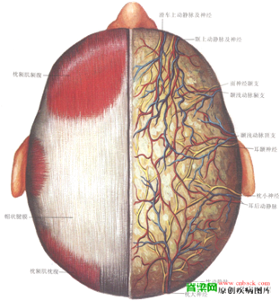 头皮部具有丰富的神经和血管,皆位于浅筋膜内。它们呈辐射状从四周向颅顶集中。在动脉方面:前方有眼动脉的终末支——额动脉及眶上动脉;侧方有颞浅动脉、耳后动脉;后方有枕动脉。在神经方面:前方有眼神经的末梢支——眶上神经、额神经,侧方有耳颞神经、耳大神经、枕小神经,后方有枕大神经。这些动脉与神经的末梢支相伴行,在颅顶部组成前、后、侧三群,恰好与本区的额、枕、顶三部相当。三群血管彼此之间以许多吻合支相连,并移行于对侧的侧副网。