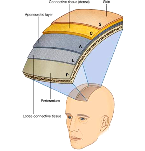 头皮适应其保护功能,由皮肤、皮下组织和帽状腱膜构成。帽状腱膜和皮肤借助致密纤维组织小梁连接得很牢固。头皮与骨膜结合得很疏松,故在颅穹窿处常常遭到头皮剥脱伤。发生于头颅的脓肿可以在皮下组织内或腱膜下层或骨膜下层的任何一层中。但其肿胀形状和散播范围均不相同。例如皮下组织出血或化脓,由于其内部具有许多小梁,妨碍了血液或脓的散播,故在皮下呈现出鲜明的轮廓。如出血(或化脓)发生于腱膜下组织,容易沿整个颅穹窿而散播。倘骨膜下组织化脓,通常局限一骨的范围,因在骨缝处,骨膜与颅骨紧相连接。