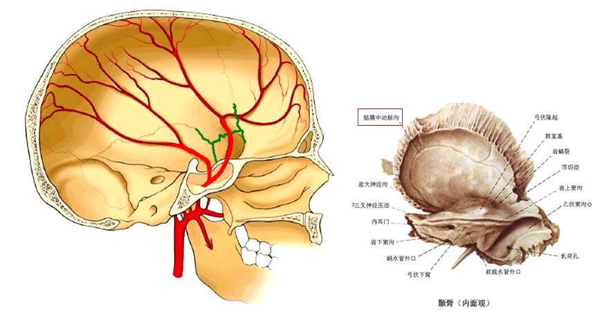 脑膜中动脉是滋养硬脑膜的主要动脉。它起自上领动脉,经过棘孔,而进入颅腔。它沿颞鳞内面之脑膜中动脉沟而行,在颞鳞与蝶骨大翼相接部,分为前后两支。前支大于后支,以凸向前的弧形行径走向颅底。在上行的过程中先经过翼区的骨管,然后与冠状缝平行上升于顶骨内面,在冠状缝后约一横指。后支小,斜往上后走向人字点。它的行径与颧弓上缘之后份及乳突嵴大致平行。并在它们的前上方一横指宽的地方。