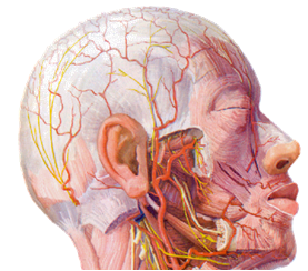 面部主要由颈外动脉的分支颞浅动脉、面动脉和上颌动脉供应。此外还有眼动脉(颈内动脉的分支)参与,这些动脉分支从面部的两侧向正中线集中,在面部构成很发达的血管网,而在眼裂、口裂周围构成动脉环,以保证面部软组织血液的供应。面深部主要为上颌动脉供应咀嚼装置(就是,上、下颌骨及其牙槽突、牙齿和所有的咀嚼肌)。