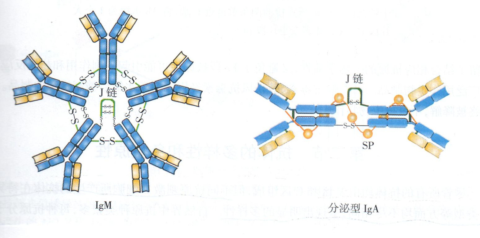 J链(joining chain)是由124个氨基酸组成、富含半胱氨酸的酸性糖蛋白,分子量约15kD,由浆细胞合成;主要功能是将单体抗体分子连接为二聚体或多聚体。2个IgA单体由J链连接形成二聚体,5个IgM单体由二硫键相互连接,并通过二硫键与J链连接形成五聚体。IgG、IgD和IgE常为单体,无J链。