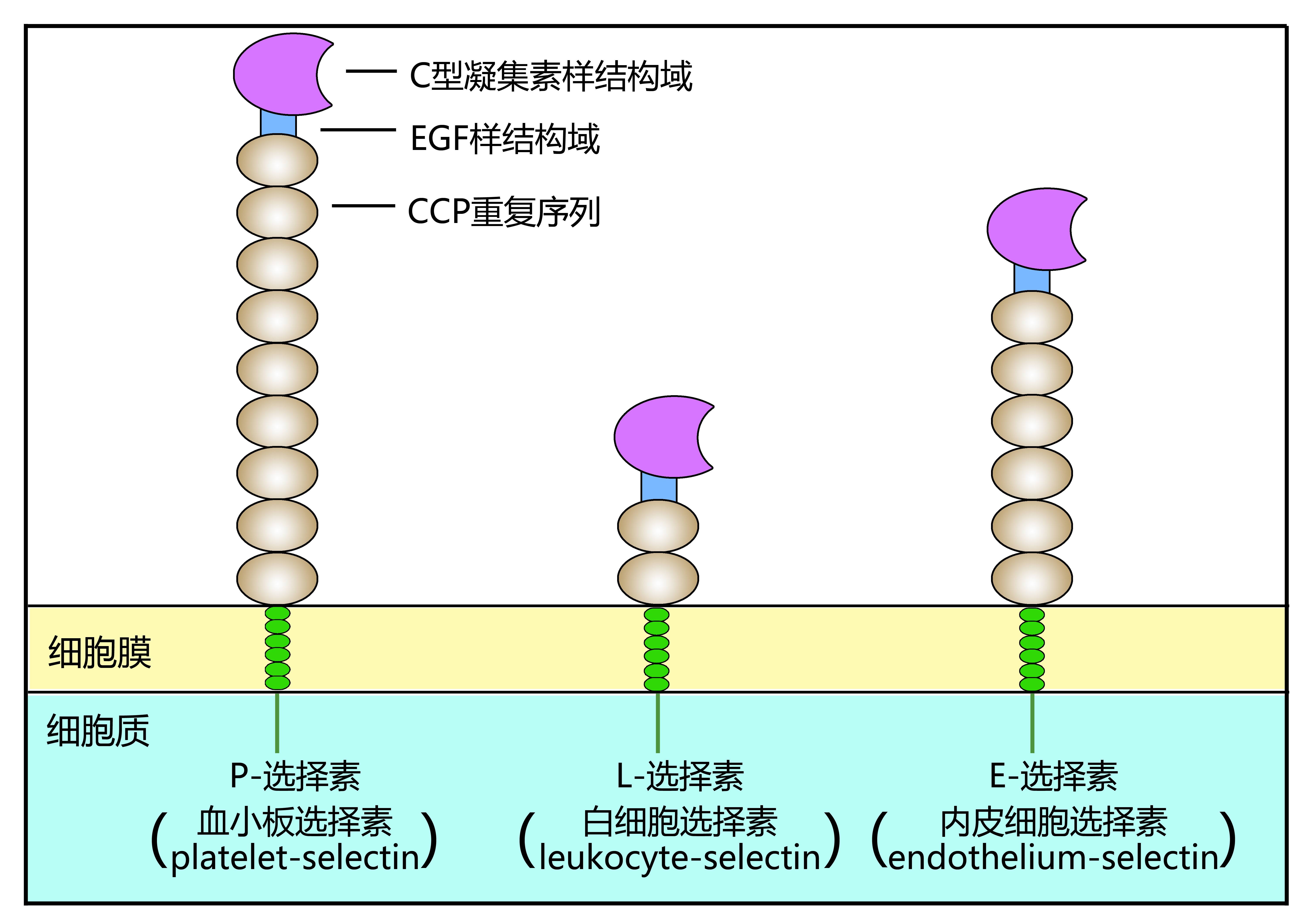 1.种类和结构 选择素家族(selectinfamily)包括白细胞选择素(leukocyte-selectin,L-选择素)(CD62L)、血小板选择素(platelet-selectin,P-选择素)(CD62P)和内皮细胞选择素(endothelium-selectin,E-选择素)(CD62E),分别表达于白细胞、血小板和血管内皮细胞表面。其家族各成员均为跨膜的糖蛋白分子,其膜外区结构相似,均由C型凝集素(CL)结构域、表皮生长因子(EGF)样结构域和补体调节蛋白结构域组成。其中CL结构域可结合某些碳水化合物,是选择素分子结合配体的部位。