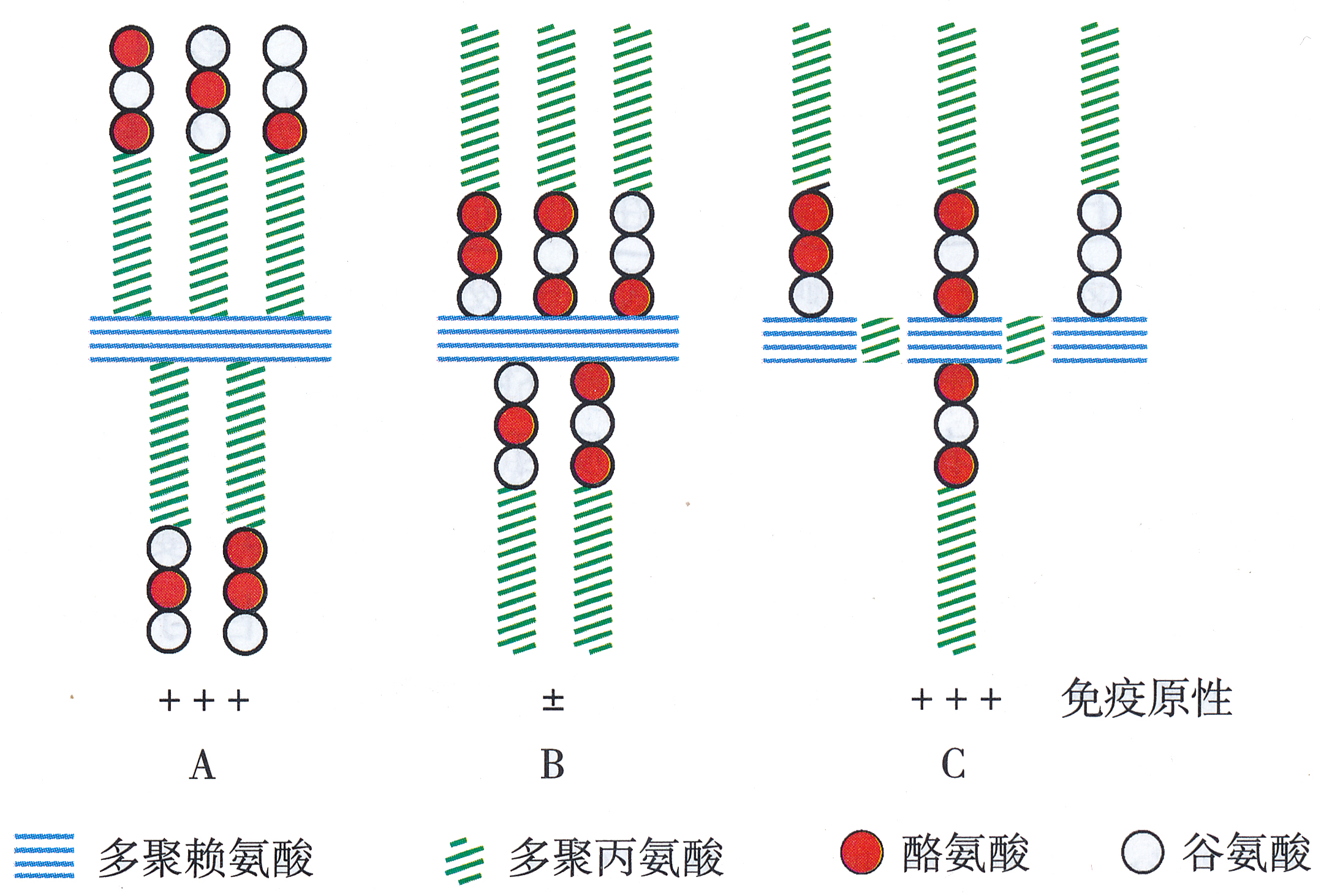 5.易接近性抗原表位在空间上被BCR所接近的程度。抗原分子中表位氨基酸残基所处侧链位置不同,可影响抗原与B细胞的BCR的空间结合,从而影响抗原的免疫原性。如图所示,氨基酸残基在侧链的位置不同(A与B相比),其免疫原性也不同;而氨基酸残基因侧链间距不同(B与C相比),使BCR可接近性不同,故免疫原性也不同抗原氨基酸残基的位置和间距决定了该抗原的免疫原性。以多聚赖氨酸为骨架,以多聚丙氨酸加酪氨酸和谷氨酸为侧链,组成抗原分子,结果当酪氨酸和谷氨酸残基在侧链的外侧时该抗原具有较强的免疫原性(A),而当酪氨酸和谷氨酸残基位于侧链内侧时,其免疫原性则较弱或无(B);但是,若将各侧链间距拉大,尽管酪氨酸和谷氨酸残基位于侧链内侧,但其免疫原性仍较强(C)。