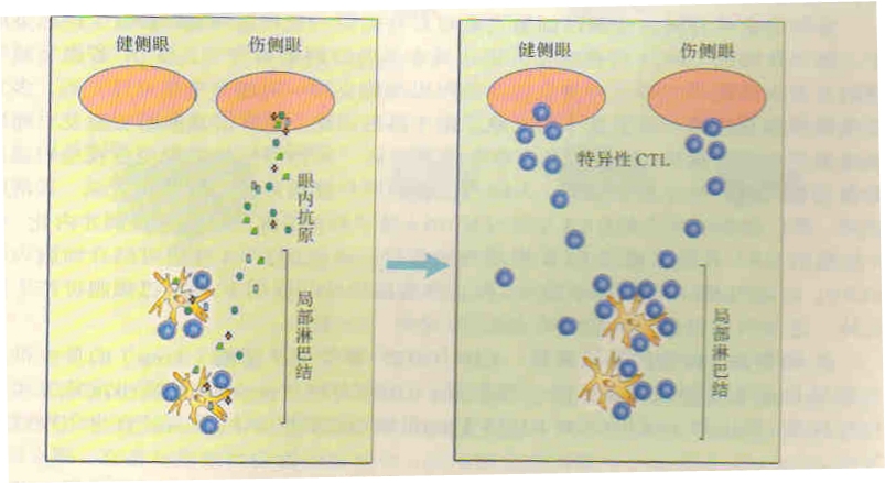 1.免疫隔离部位抗原的释放 在人体脑、睾丸、眼球、心肌和子宫都存在着免疫隔离部位,其中的某些抗原成分和免疫系统相对隔离。在免疫系统发育的过程中,针对这些隔离抗原的淋巴细胞克隆未经历诱导免疫耐受的过程。在正常状态下,隔离抗原不进入血液循环和淋巴液;自身反应性淋巴细胞也不能进入免疫隔离部位。在某些情况下,如手术、外伤感染时,免疫隔离部位的抗原可释放入血液或淋巴液,得以与免疫系统接触,刺激自身反应性淋巴细胞发生免疫应答,CTL可对眼睛健侧眼睛的细胞发动攻击,引发自身免疫性交感性眼炎。