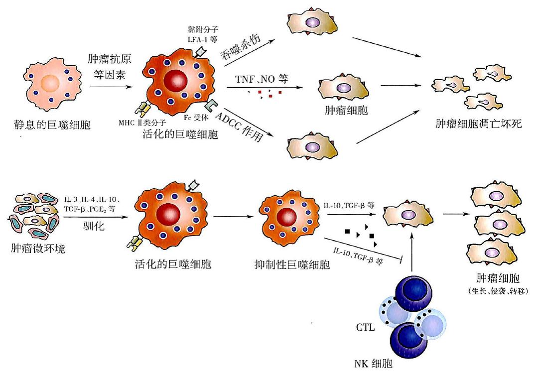 (2)巨噬细胞的抗肿瘤作用:巨噬细胞在肿瘤免疫中具有双重作用(图13-4),一方面,巨噬细胞作为专职性APC和固有免疫效应细胞具有抗肿瘤作用,其机制在于可通过提呈肿瘤抗原诱导特异性抗肿瘤免疫应答,活化的巨噬细胞可非特异吞噬和销毁肿瘤细胞,也可通过ADCC杀伤肿瘤细胞,还可通过分泌TNF、NO等细胞毒性因子间接杀伤肿瘤细胞。另一方面,巨噬细胞可以被肿瘤细胞分泌的某些物质驯化,成为免疫抑制性巨噬细胞,能促进肿瘤的发展和转移。