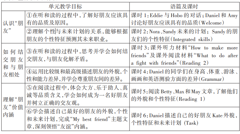 单元整体教学设计首先要对单元语篇进行细致的解读,探究各部分内容之间的关联,明确单元主题。本课教学内容为“Friends”,是模块一“Teenage life”的第一个单元,类属“人与自我”主题语境,该单元以“我”为视角,围绕“朋友与重要品质”的主题展开,共有6个课时的内容,涉及10篇课内语篇和教师在研读和分析的基础上1篇课后练习语篇。,要对所有语篇的主题意义进行整合,并提炼出学生需要逐层掌握的核心主题维度:知道什么是“朋友”,了解好朋友的必备品质;知道如何结交朋友和与朋友相处,树立正确的交友观;理解朋友的深层价值意义,珍惜友谊。此外,还可以补充一些与主题相关的语篇,如英语《随堂反馈》中的阅读语篇“What to do after a fight with friends”和听力语篇“How to makemore friends”等,以帮助学生拓展英语学习渠道,深刻把握主题意义内涵。
