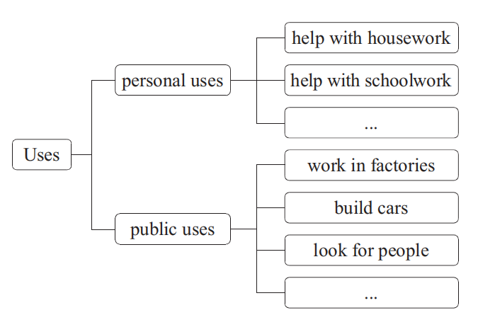 在学生按照结构化信息处理文本后,教师引导他们展开第二次整体性阅读,并利用思维导图(如下)引导其概括与整合机器人的两大类用途:personal uses 与 public uses。