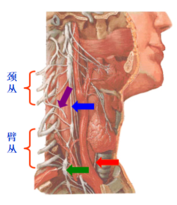 (1)颈丛皮支:包括枕小神经、耳大神经、颈横神经、锁骨上神经,主要分布于颈部皮肤。神经点:即颈丛皮神经的集中穿出点,位于胸锁乳突肌后缘中点处。