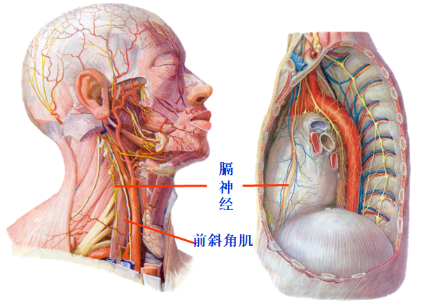 (2)膈神经  phrenic nerve :由C3~C5前支组成,颈段经前斜角肌前面,胸段经肺根前方,分布于膈  胸膜 心包