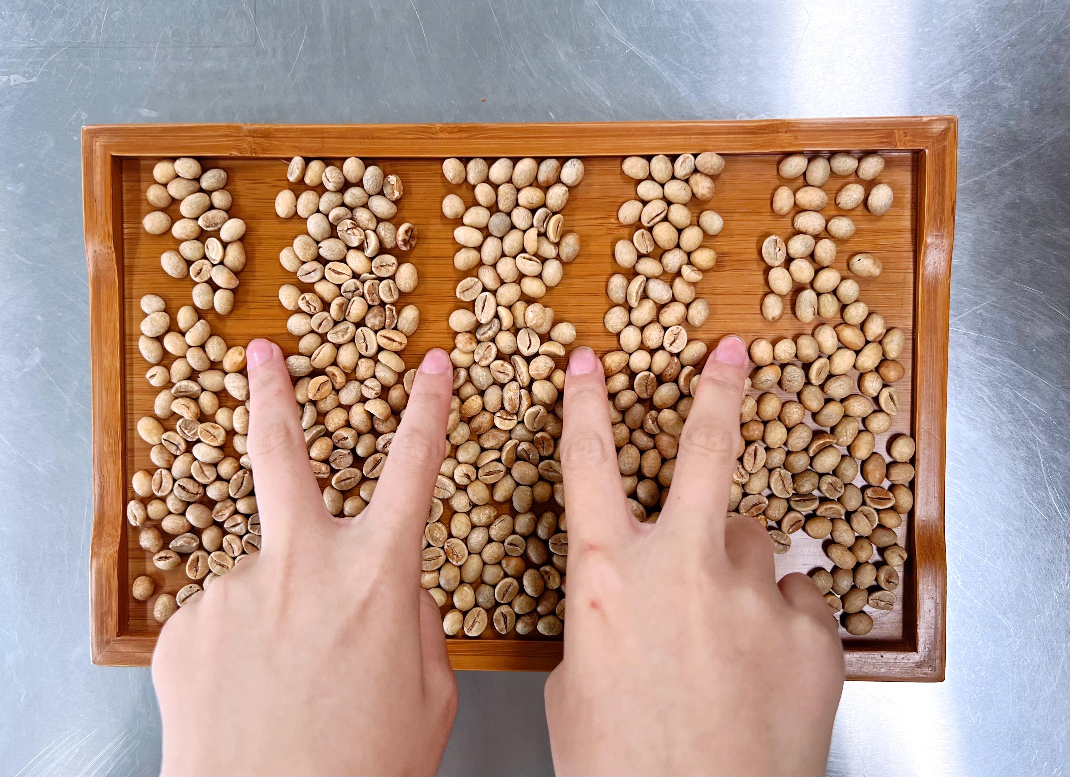 挑选出石头、木片等异物以及黑豆、霉豆、虫蛀豆、未成熟豆等不良的生豆,选择有光泽、颗粒饱满的生豆,如图1-2-6所示。