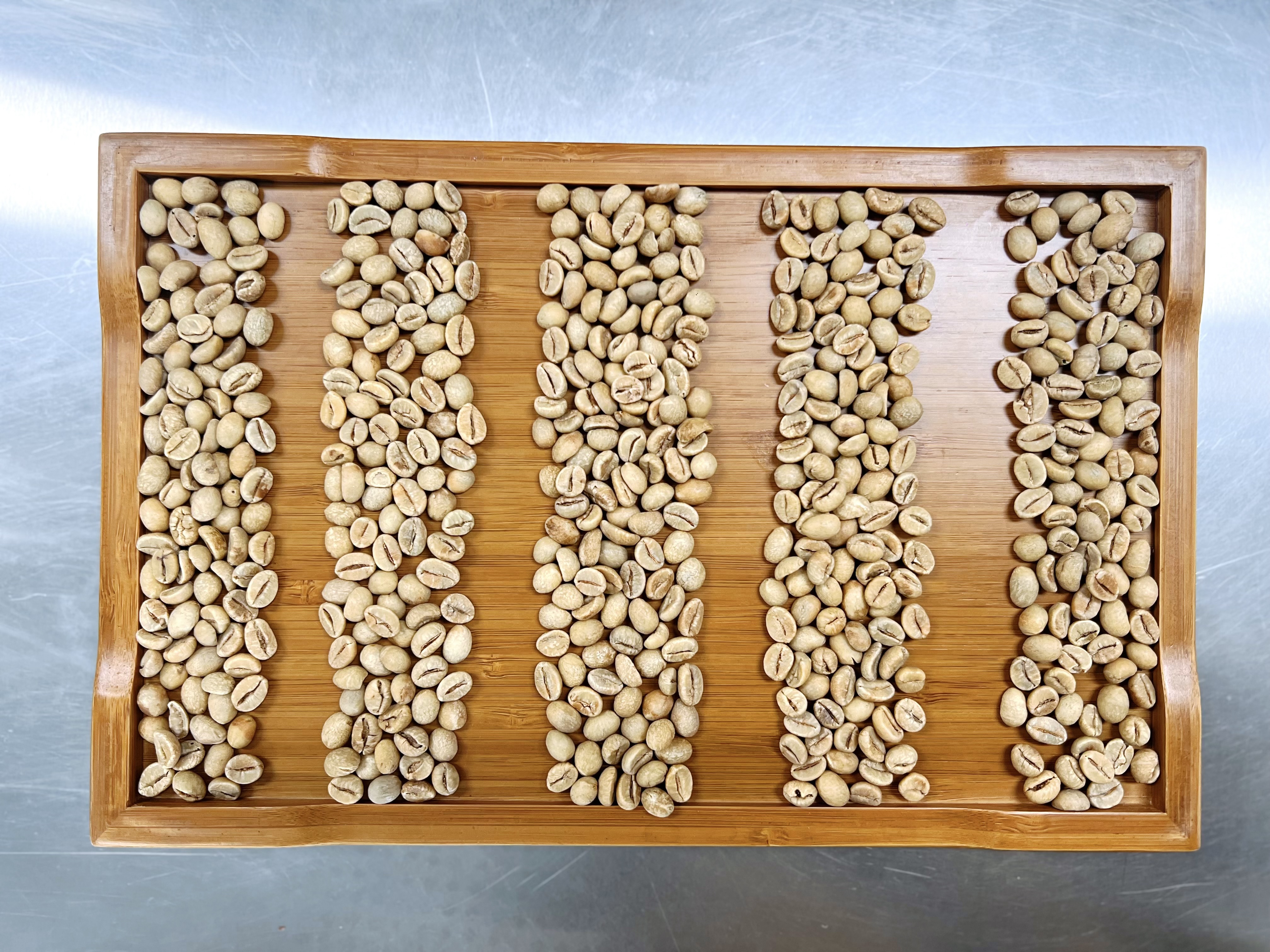 生豆颗粒的大小与味道没有直接的关系。但是,一般情况下由于生豆大小不一,在烘焙时会受热不均匀,从而造成烘焙的不均匀。因此,一般情况下要将咖啡生豆按照大小分类再分别烘焙,如图1-2-5所示。