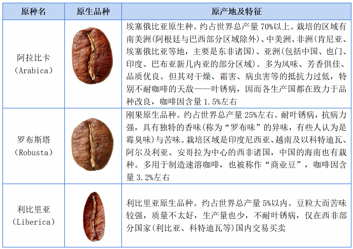 咖啡豆的种类很多,分类方法更是多种多样,比如可以按照原种或原产地进行咖啡豆分类,如表1-2-1所示。